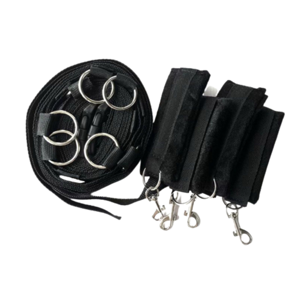 Settiin sisältyy kaksi erillistä, patjan alle klipsuilla kiinnitettävää hihnaa metallirenkailla sekä sisäpinnaltaan pehmeät nilkka- ja rannekahleet kiinnityskoukuilla.